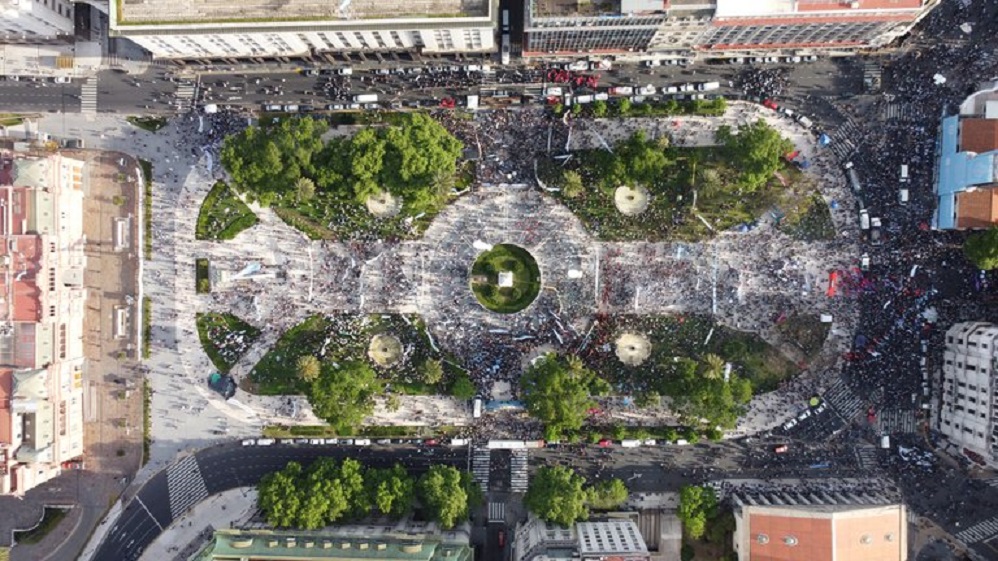“Más de la mitad de los argentinos estamos bajo la línea de la pobreza. El 44% del país es pobre. No come más de una vez al día. ¿Y usted quiere pagar la deuda? ¿Con qué? Estamos hartos de pagar deudas”, indicó Bonafini durante el acto en la Plaza de Mayo.