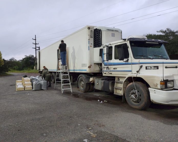Al realizar la inspección, los funcionarios detectaron en el semirremolque entre cajones de frutas 36 bultos que contenían hojas de coca en estado natural, cuyo total ascendió a 869 kilos 900 kilos.