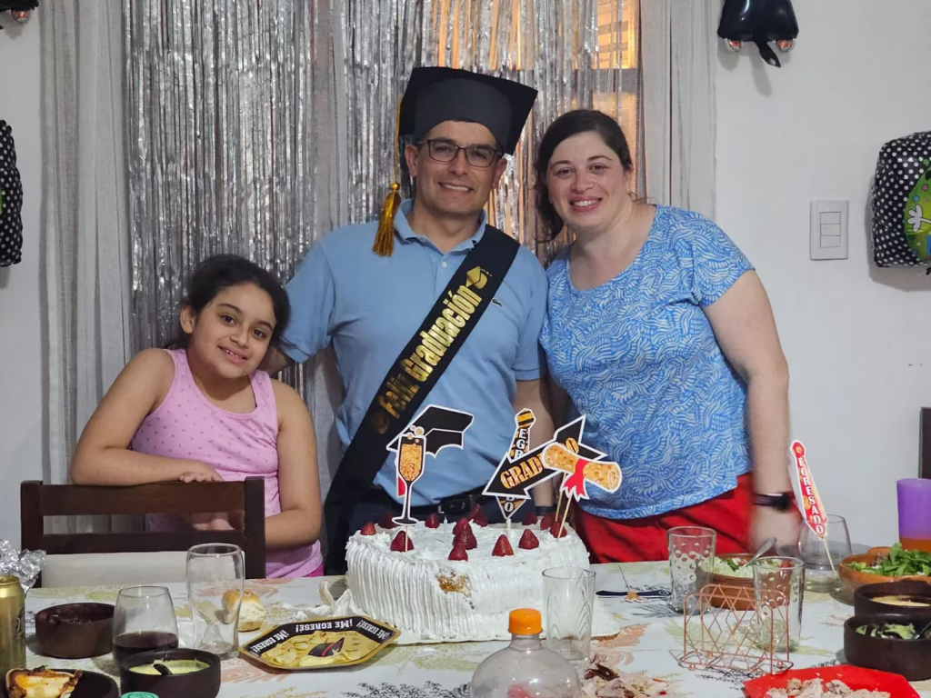 “Si bien hoy me pude recibir, el trabajo que hizo mi compañera fue impresionante. Yo laburaba de 6 a 13, volvía a casa a almorzar con mi nena y después me iba a clases y durante ese tiempo alguien tenía que estar con ella y esa persona era María -su esposa-. Después tenía que estudiar y no estaba para nada presente. Ella fue la que se puso al hombro todo”, agregó.