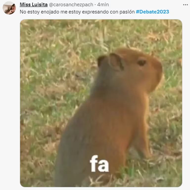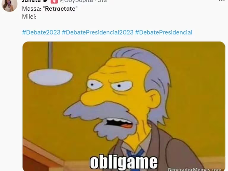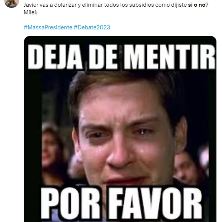 Los candidatos a presidente por Unión por la Patria y La Libertad Avanza volvieron a enfrentarse en el debate presidencial donde abordaron temas vinculados a economía, relaciones de la Argentina con el mundo, educación y salud, producción y trabajo, seguridad y derechos humanos y convivencia democrática. A medida que se desarrolló el encuentro, los usuarios no dudaron en expresar sus emociones a través de las redes sociales, donde los memes no tardaron en aparecer.