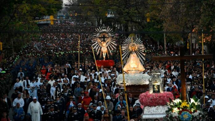 En medio del caos, el padre jesuita José Carrión afirmó haber escuchado una voz clara que advertía: “Mientras no saquen al Santo Cristo, los terremotos no cesarán”. La voz señaló la imagen del Cristo Crucificado, olvidada en la sacristía desde su llegada en 1592. A pesar de los escombros, los fieles lograron rescatar la escultura, que milagrosamente no presentaba daños. El Señor del Milagro, con su expresión de sacrificio sereno, fue colocado junto a la Virgen del Milagro en el atrio de la iglesia derruida. Los sacerdotes lideraron rogativas y procesiones, implorando el perdón divino. El 15 de septiembre, los temblores disminuyeron, y el 16 de septiembre, la calma regresó a la ciudad. Este cese de los sismos fue atribuido a la intervención de las imágenes, dando origen al “Milagro” de Salta. Desde 1692, la Fiesta del Milagro se celebra cada 15 de septiembre con una procesión multitudinaria que recorre las calles de Salta. Las imágenes del Señor y la Virgen del Milagro, adornadas con miles de claveles rojos y blancos respectivamente, son llevadas en andas por los fieles, acompañadas por cánticos, sirenas y campanas. En el monumento al 20 de febrero, los salteños renuevan su “Pacto de Fidelidad” con las palabras: “Señor, nosotros somos tuyos y tú eres nuestro”. Esta procesión, que atrae a más de 700,000 personas anualmente, es la manifestación religiosa más importante del noroeste argentino y la segunda del país, solo detrás de la peregrinación a Luján. En 1902, por iniciativa del obispo Matías Linares, el Papa León XIII concedió la coronación pontificia a ambas imágenes, un honor que reafirmó su importancia espiritual. La ceremonia, celebrada el 13 de septiembre de 1902, contó con la presencia de autoridades eclesiásticas de Roma y Argentina.