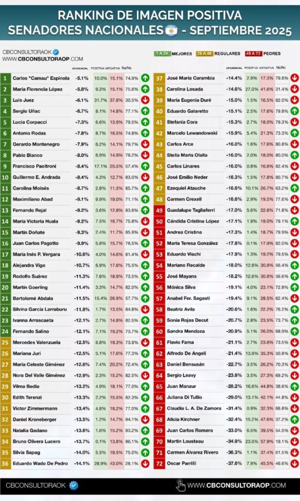 La encuestadora CB Consultora hizo un relevamiento en setiembre sobre la imagen positiva que tienen los senadores nacionales.