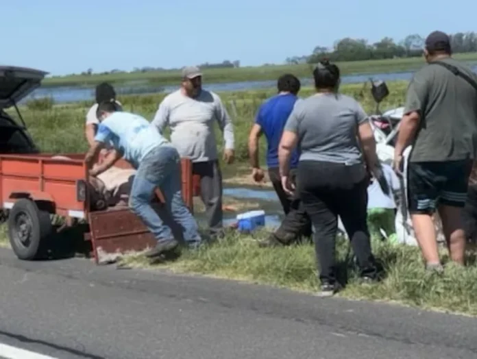 Un camión jaula que transportaba cerdos volcó en la Ruta Nacional 7 a la altura de la localidad bonaerense de Ingeniero Silveyra y, en cuanto se enteraron de la noticia, los vecinos de la zona se acercaron para llevarse a los animales, ya sea vivos o muertos.