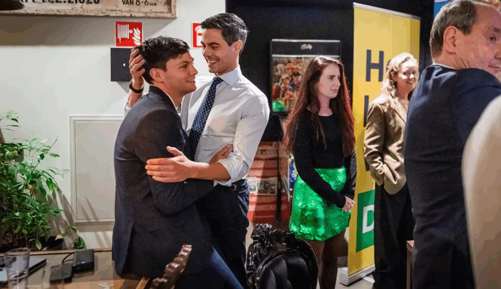 El festejo del argentino Nicolás Keenan tras elección de su pareja Rob Jetten como primer ministro de Países Bajos