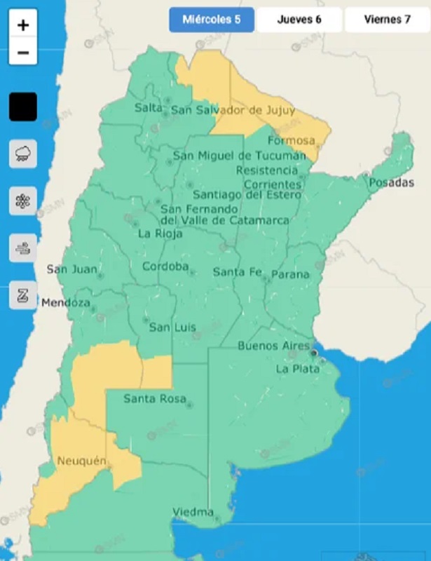 De esta manera, el SMN mantenía una alerta amarilla que rige este miércoles para zonas de las provincias de Formosa, Salta, Chaco, Mendoza, San Luis, Neuquén y Río Negro.