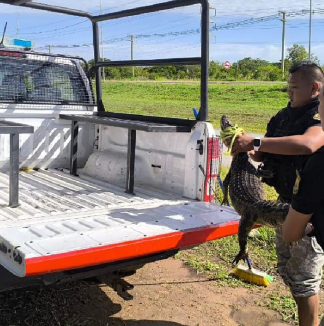 La intervención se originó luego de que personal de seguridad de una empresa ubicada sobre ruta provincial 5 informara la presencia del yacaré en inmediaciones de la playa de estacionamiento.