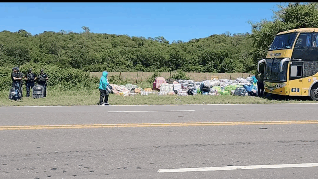 Policías tratan de evitar que los pasajeros se lleven los bultos, aunque hay incertidumbre sobre la disposición de la justicia sobre lo que ocurrirá con la mercadería que trasladaba el colectivo.
