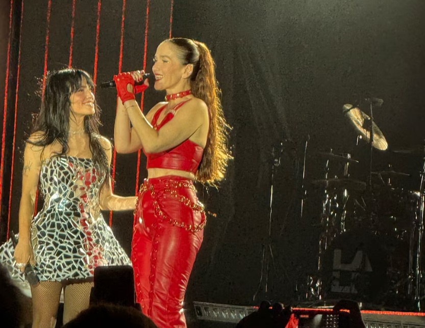 La pausa tuvo recompensa inmediata. Con un vestido cubierto de piezas brillantes y botas altas negras, Lali cedió el centro del escenario a Oreiro, quien apareció entonando las primeras estrofas de “Cambio Dolor”, el icónico tema de Muñeca Brava que abrió una era en la televisión y la música latina. Las exclamaciones y los aplausos explotaron cuando ambas artistas, separadas por generaciones pero unidas por el carisma, comenzaron a cantar juntas. Oreiro lucía un look rojo total: top, pantalón y botas a juego, marcando así otro momento de alto voltaje visual en la noche.