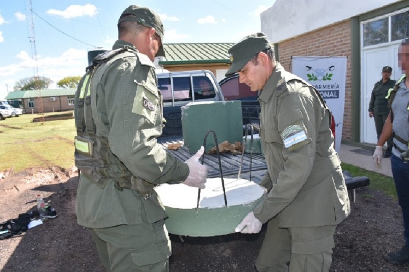 Por disposición del Magistrado interviniente, la camioneta y el involucrado fueron trasladados hacia las instalaciones del Escuadrón 1 “Roque Sáenz Peña”. En la requisa el can “Elena” dio indicios de una posible carga ilícita al señalizar activamente la parte trasera del vehículo. Inmediatamente, los uniformados registraron la caja, observando que transportaba bloques de cemento con formas de mesas y bancos. Uno de ellos aparentemente producto del movimiento del rodado, logró rasgarse en uno de sus laterales lo que permitió a los gendarmes identificar un envoltorio de nylon transparente en el interior del cemento.