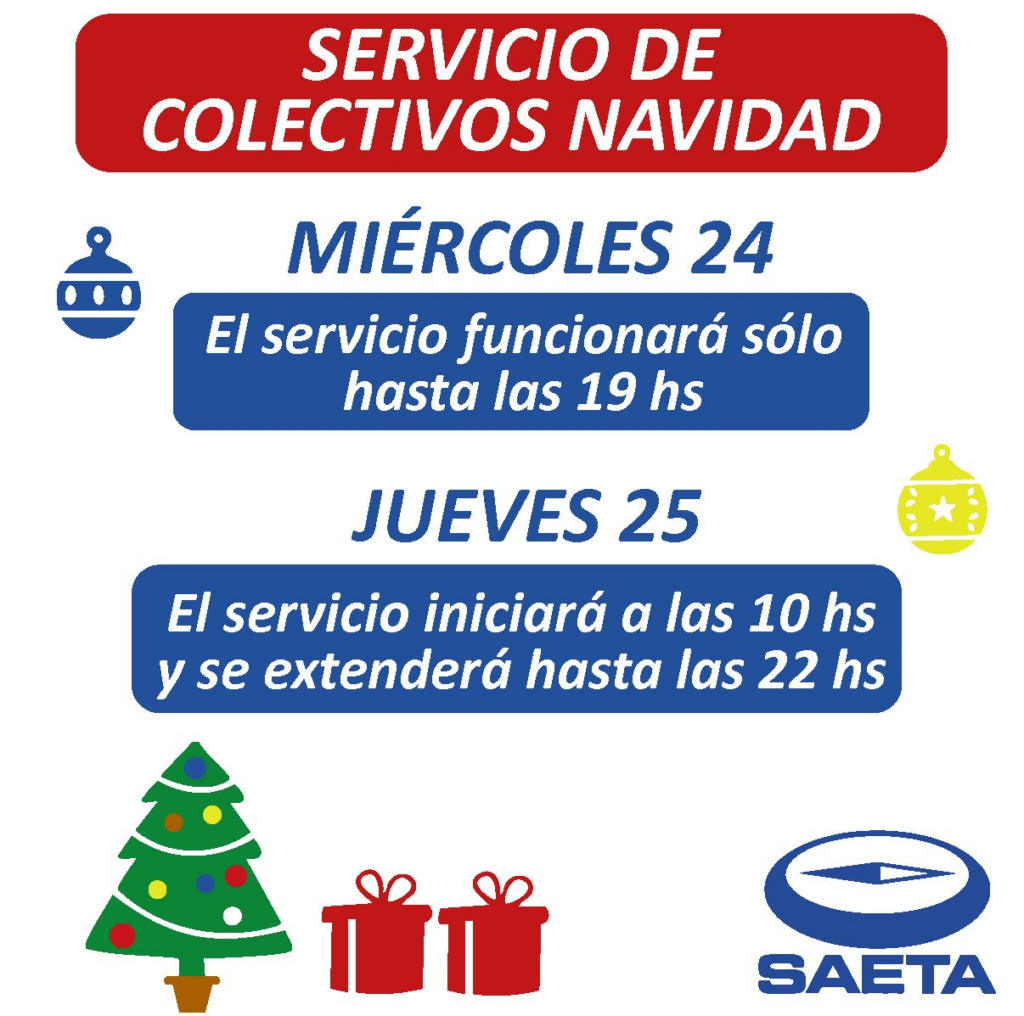 SAETA recuerda a sus usuarios que mañana miércoles 24, el servicio de colectivos en los once municipios que componen el área Metropolitana, funcionará solo hasta las 19, horario en el que pasará el último coche de cada línea por el centro en dirección a los barrios y las empresas para su guardado. Como todos los años el servicio se retomará el 25 a las 10 hs extendiéndose sólo hasta las 22hs.