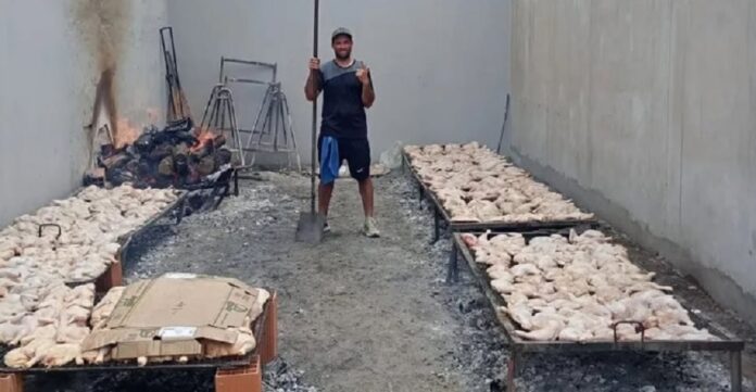 Gonzalo no solo compró los pollos, sino que se puso al frente de la parrilla en el club monumental y asó 200 pollos, además de chorizos y carne que donó la gente al ver la movida.