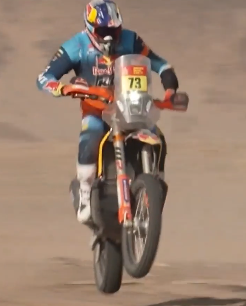 En Motos, el salteño Luciano Benavides terminó con lo justo sobre su KTM oficial ya que la cubierta trasera se desbandó y pudo haberle costado el abandono al piloto de 30 años. “En los últimos cinco o seis pilotos empecé a sentir cómo la cubierta me empezó a pegar y en el tanque y dije ‘ya se explota’. En la última recta le supliqué a Dios. Hoy perdimos un poco de tiempo”, contó al llegar a la meta tras terminar séptimo y ser sexto en la general.
