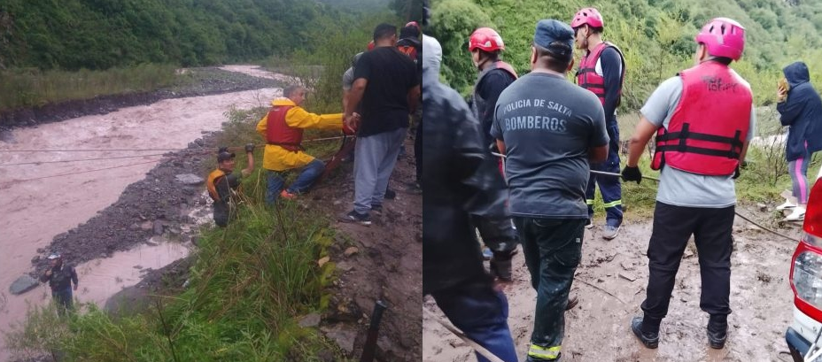 En La Caldera, dos hombres mayores de edad y una menor de edad fueron rescatados al quedar varados ante la crecida del río Wierna en inmediaciones a un camping de la zona. También se auxilió a cuatro personas que se encontraban con el vehículo anegado en la zona.