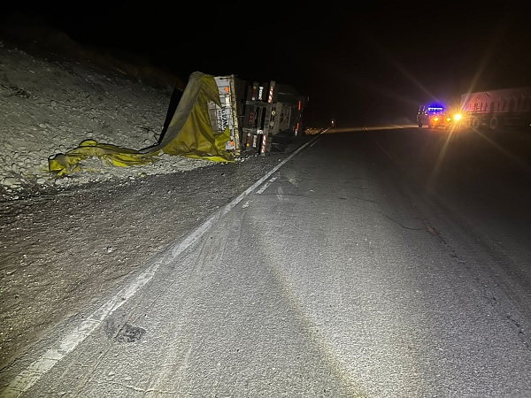 Al arribar, los efectivos constataron la presencia de un camión con acoplado completo, perteneciente a una empresa minera, que había colisionado contra el cerro y volcado sobre su lateral derecho, correspondiente al lado del conductor, quedando detenido sobre la banquina.