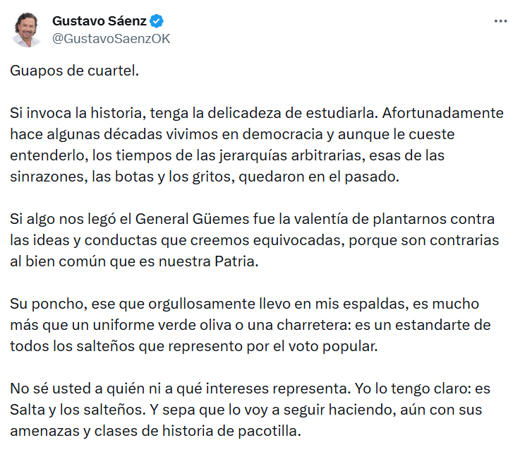 Tras la réplica del gobernador, quien habló de “guapos de cuartel” y cuestionó las jerarquías, Milani volvió a la carga con un mensaje todavía más filoso. “Gobernador, bájese del pony. Usted no representa ni siquiera es la sombra del caudillo Güemes”, escribió.