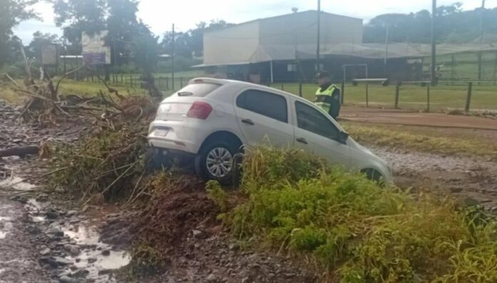 El episodio ocurrió en medio del fuerte temporal que afectó a distintos sectores de la ciudad, cuando el agua acumulada sobre la calzada superó la capacidad de escurrimiento y avanzó con fuerza sobre el sector vial. En esas circunstancias, un Volkswagen Gol de color blanco fue desplazado por la corriente, dejando a sus ocupantes atrapados dentro del rodado.