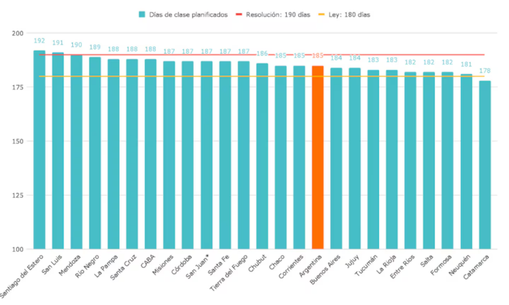 A su vez, hay 14 provincias que no alcanzarán los 190 días de clase, pero sí las 760 horas anuales, porque ofrecen una jornada escolar de más de 4 horas. Catamarca, en el otro extremo, tiene planificados 178 días de clase, por debajo del estipulado por la Ley 25.864.
