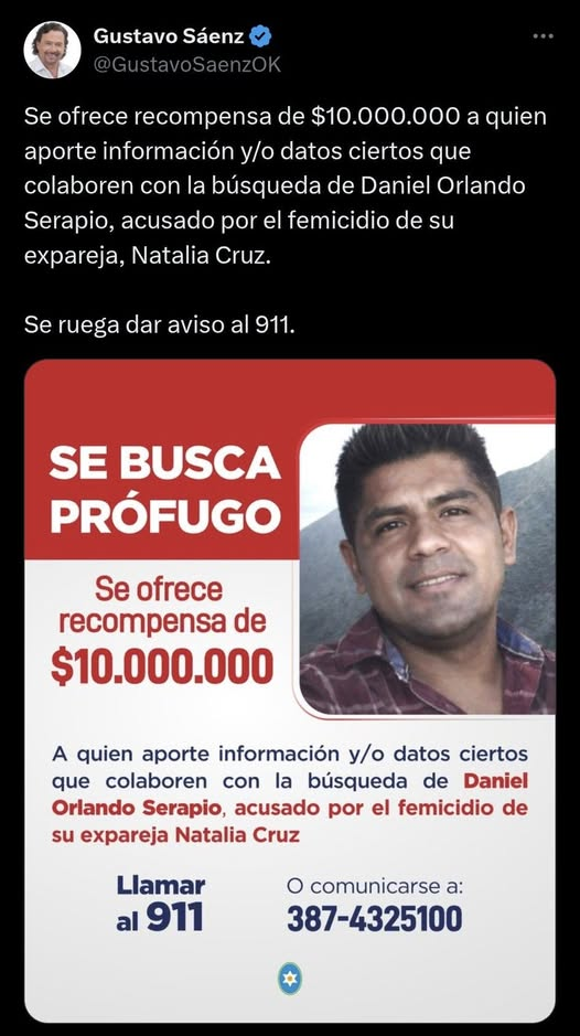 El gobernador de Salta Gustavo Sáenz anunció este mediodía, a través de su cuenta oficial en X, una recompensa millonaria para dar con el principal acusado de un femicidio que conmociona a la provincia.