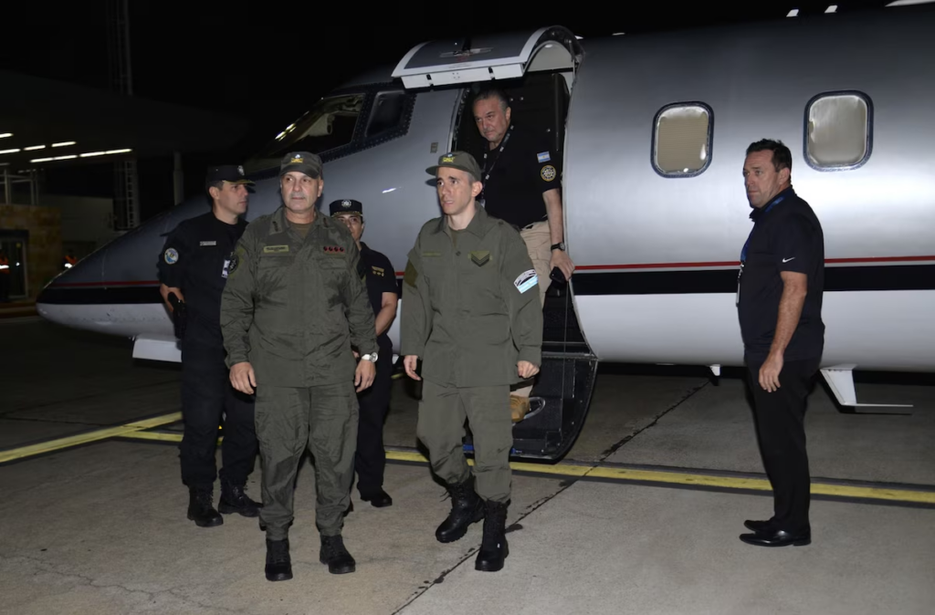 Nahuel Gallo desciende de la aeronave que lo trajo a la Argentina, vestido con el uniforme de Gendarmería y escoltado por un operativo de seguridad