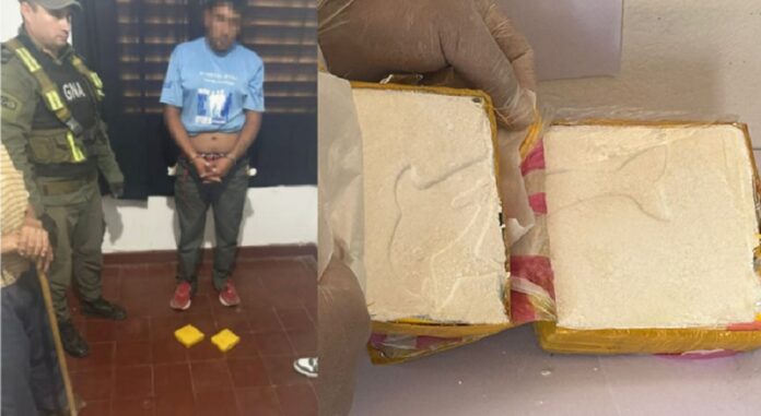 Ante las altas probabilidades de estar frente a un hecho ilícito, los uniformados realizaron una requisa sobre el involucrado en donde pudieron constatar que el ciudadano transportaba adosados a su cuerpo dos envoltorios de forma rectangular envueltos en cinta de color amarillo con una sustancia blancuzca en su interior.