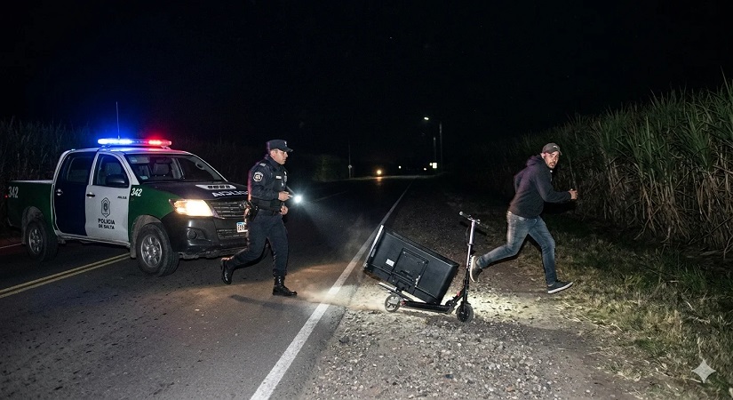 Insólito: Un sujeto huyó por los cañaverales de la ruta 50 en Orán tras ser descubierto trasladando un TV en monopatín