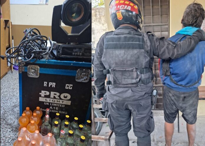 En consecuencia, un hombre de 34 años fue detenido y secuestraron un baúl de transporte de equipo de sonido, cables, una luz robótica y bebidas, quedando a disposición de la Justicia.