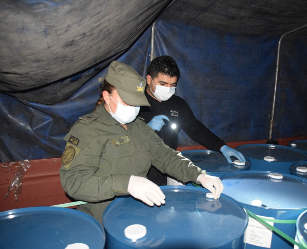 Al momento de realizar el control físico de ambos transportes de cargas Peligrosas, los gendarmes constataron que el primer rodado poseía 95 tambores color azul y en el segundo había 96 tambores. Todos se encontraban identificados como “Acetato de etilo” con un peso 184 kilos cada uno.
