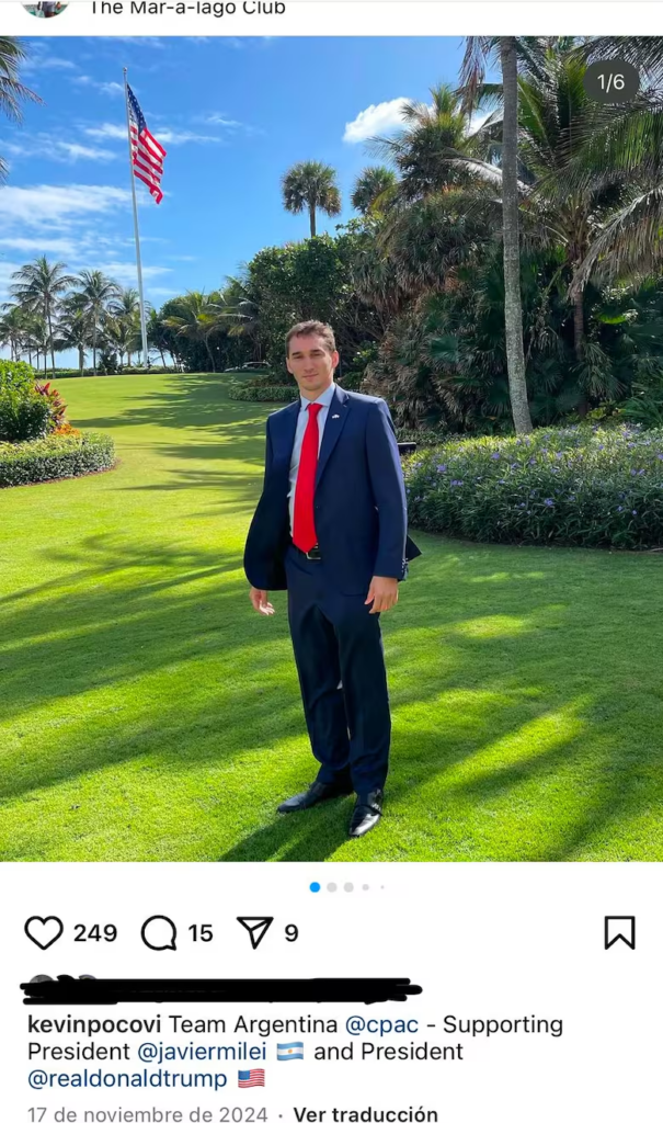 Kevin Pocovi, uno de los hermanos de la novia e hijo de Marcelo, aparece vinculado a Inversora Eslava SA, empresa con la que el PAMI un contrato de alquiler por 36 meses de un edificio en la calle Reconquista 46 de Buenos Aires, por más de $2700 millones en 2024, según surge de un expediente de la Inspección General de Justicia.