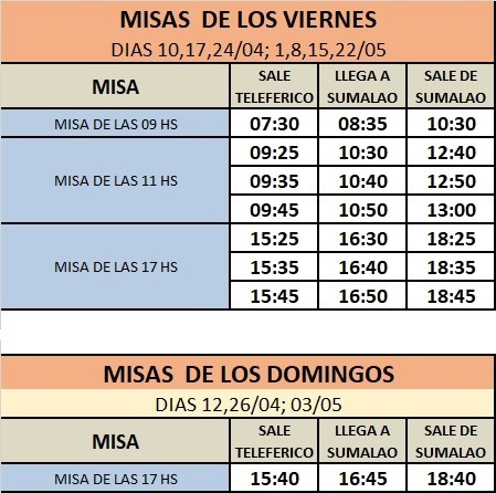 Los días 10, 17 y 24 de abril; 1, 8, 15 y 22 de mayo habrá servicios especiales para las misas de 9, 11 y 17 hs, que partirán hacia Sumalao a las 7.30; 9:25; 9:35; 9:45; 15:25; 15:35 y 15:45hs. La salida desde Sumalao hacia la ciudad de Salta está programada para las 10.30; 12.40; 12.50; 13.00; 18.25; 18.35 y 18.45hs.