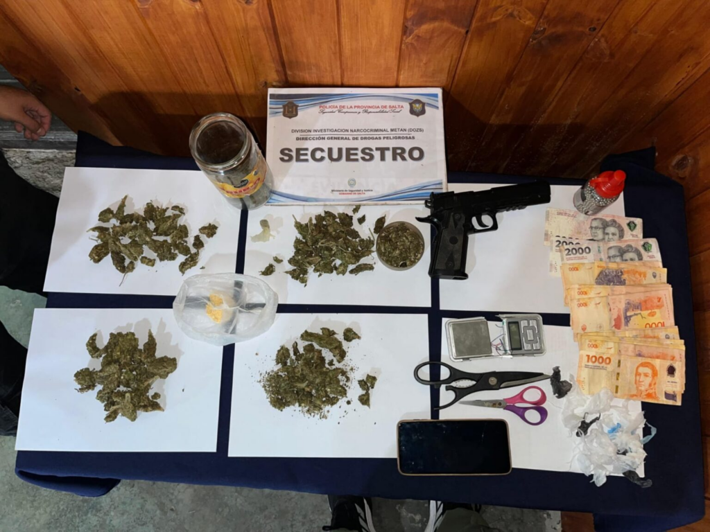 Se secuestraron más de 800 dosis de droga, entre marihuana y cocaína. También más de medio millón de pesos argentinos, elementos de fraccionamiento, un arma de aire comprimido, entre otros elementos de interés para la causa.