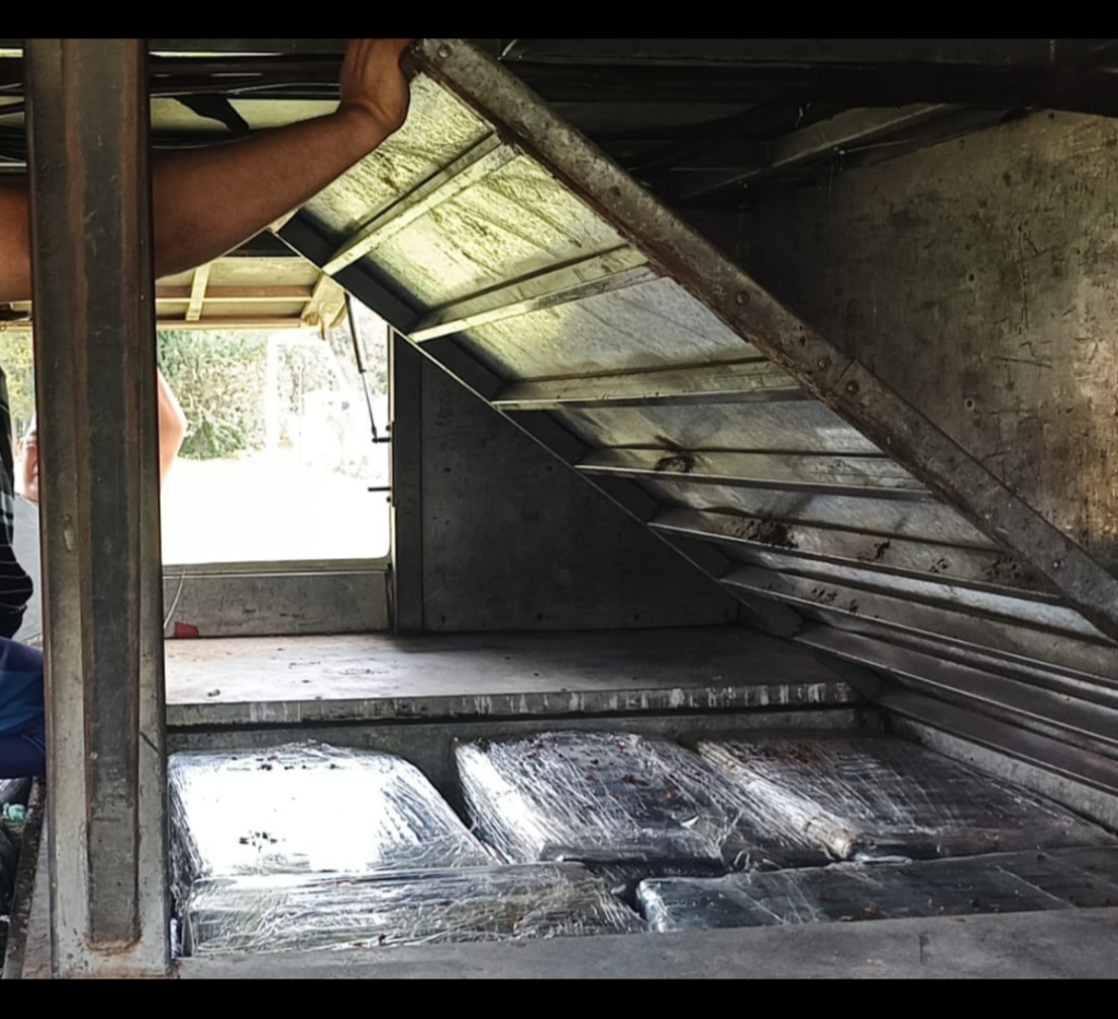 En este contexto, en el control sobre el transporte el personal de la Fuerza secuestró 280 kilos de hojas de coca en estado natural, que iban escondidos en un doble fondo de la bodega y 112 bultos de mercadería de origen extranjero.